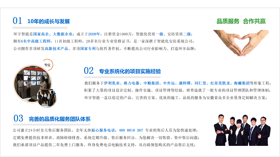 合肥市環宇智能工程有限公司成立于2008年,科創版上市企業,現注冊資金1000萬元整,電子與智能化系統集成資質壹級,安防資質貳級,是“國家高新技術企業”、“合肥市高新技術產品認定企業”、“安徽省安防協會會員單位”、“AAA級信用等級認證企業”、“AAA級重合同守信用企業”、“合肥市創新型企業”、是行業領先的智能化整體解決方案的集成商。